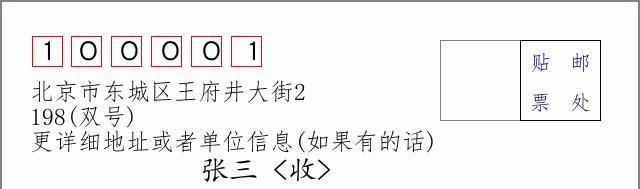 说明:以上列表中的邮件编码100001为北京市东城区王府井大街2-198(双号)的标准邮编,适用于大部分普通邮寄场景。