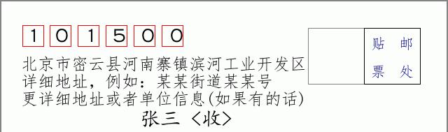 说明:以上列表中的邮件编码101500为北京市密云县河南寨镇滨河工业开发区的标准邮编,适用于大部分普通邮寄场景。