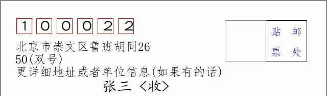 说明:以上列表中的邮件编码100022为北京市崇文区鲁班胡同26-50(双号)的标准邮编,适用于大部分普通邮寄场景。