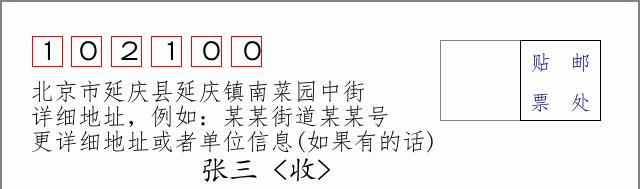 说明:以上列表中的邮件编码102100为北京市延庆县延庆镇南菜园中街的标准邮编,适用于大部分普通邮寄场景。