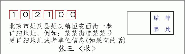 说明:以上列表中的邮件编码102100为北京市延庆县延庆镇恒安西街一巷的标准邮编,适用于大部分普通邮寄场景。
