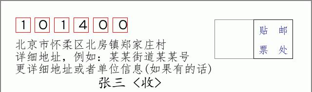 说明:以上列表中的邮件编码101400为北京市怀柔区北房镇郑家庄村的标准邮编,适用于大部分普通邮寄场景。