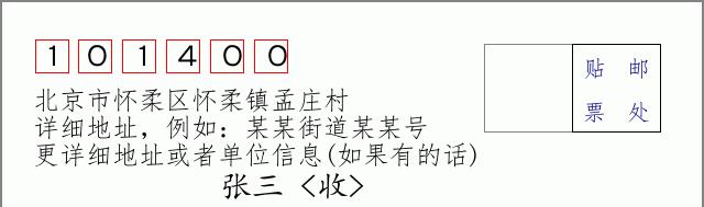 说明:以上列表中的邮件编码101400为北京市怀柔区怀柔镇孟庄村的标准邮编,适用于大部分普通邮寄场景。