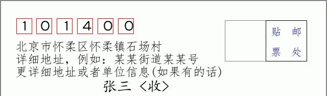 说明:以上列表中的邮件编码101400为北京市怀柔区怀柔镇石场村的标准邮编,适用于大部分普通邮寄场景。