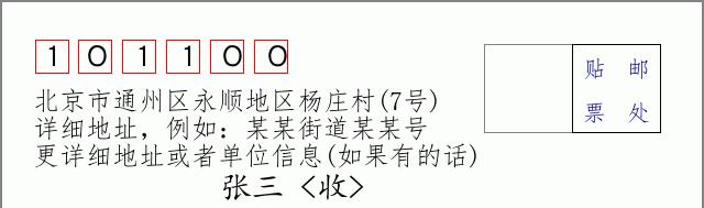 说明:以上列表中的邮件编码101100为北京市通州区永顺地区杨庄村(7号)的标准邮编,适用于大部分普通邮寄场景。