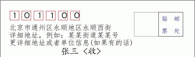 说明:以上列表中的邮件编码101100为北京市通州区永顺地区永顺西街的标准邮编,适用于大部分普通邮寄场景。