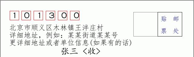 说明:以上列表中的邮件编码101300为北京市顺义区木林镇王泮庄村的标准邮编,适用于大部分普通邮寄场景。