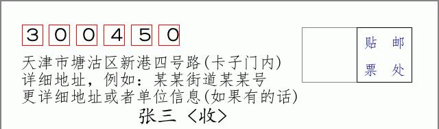 说明:以上列表中的邮件编码300450为天津市塘沽区新港四号路(卡子门内)的标准邮编,适用于大部分普通邮寄场景。