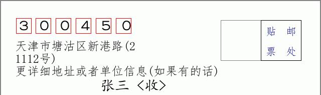 说明:以上列表中的邮件编码300450为天津市塘沽区新港路(2-1112号)的标准邮编,适用于大部分普通邮寄场景。