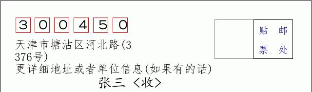 说明:以上列表中的邮件编码300450为天津市塘沽区河北路(3-376号)的标准邮编,适用于大部分普通邮寄场景。
