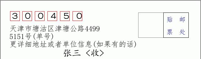 说明:以上列表中的邮件编码300450为天津市塘沽区津塘公路4499-5151号(单号)的标准邮编,适用于大部分普通邮寄场景。