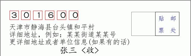 说明:以上列表中的邮件编码301600为天津市静海县台头镇和平村的标准邮编,适用于大部分普通邮寄场景。
