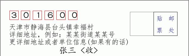 说明:以上列表中的邮件编码301600为天津市静海县台头镇幸福村的标准邮编,适用于大部分普通邮寄场景。