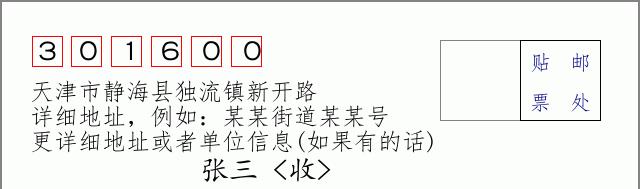 说明:以上列表中的邮件编码301600为天津市静海县独流镇新开路的标准邮编,适用于大部分普通邮寄场景。