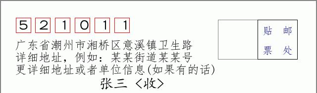 说明:以上列表中的邮件编码521011为广东省潮州市湘桥区意溪镇卫生路的标准邮编,适用于大部分普通邮寄场景。