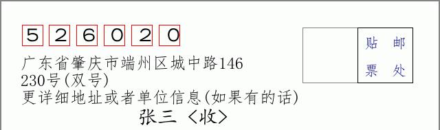 说明:以上列表中的邮件编码526020为广东省肇庆市端州区城中路146-230号(双号)的标准邮编,适用于大部分普通邮寄场景。