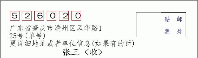 说明:以上列表中的邮件编码526020为广东省肇庆市端州区风华路1-25号(单号)的标准邮编,适用于大部分普通邮寄场景。