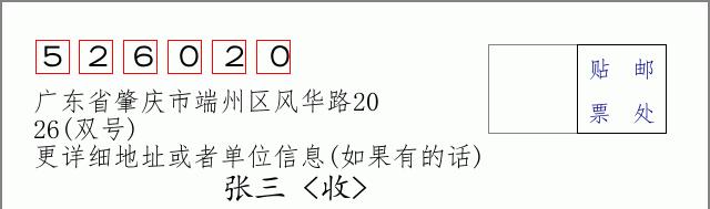 说明:以上列表中的邮件编码526020为广东省肇庆市端州区风华路20-26(双号)的标准邮编,适用于大部分普通邮寄场景。